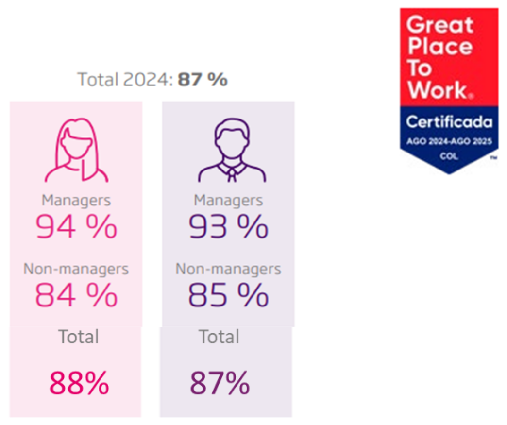 In 2024, we measured the work environment under the Great Place to Work (GPTW) methodology, an international standard that evaluates the quality of the work environment. This approach is based on the premise that a positive, healthy work environment that focuses on the employee experience, building trust, pride and camaraderie, contributes to a company's success. To evaluate companies, GPTW conducts employee surveys and analyzes their opinions and references.