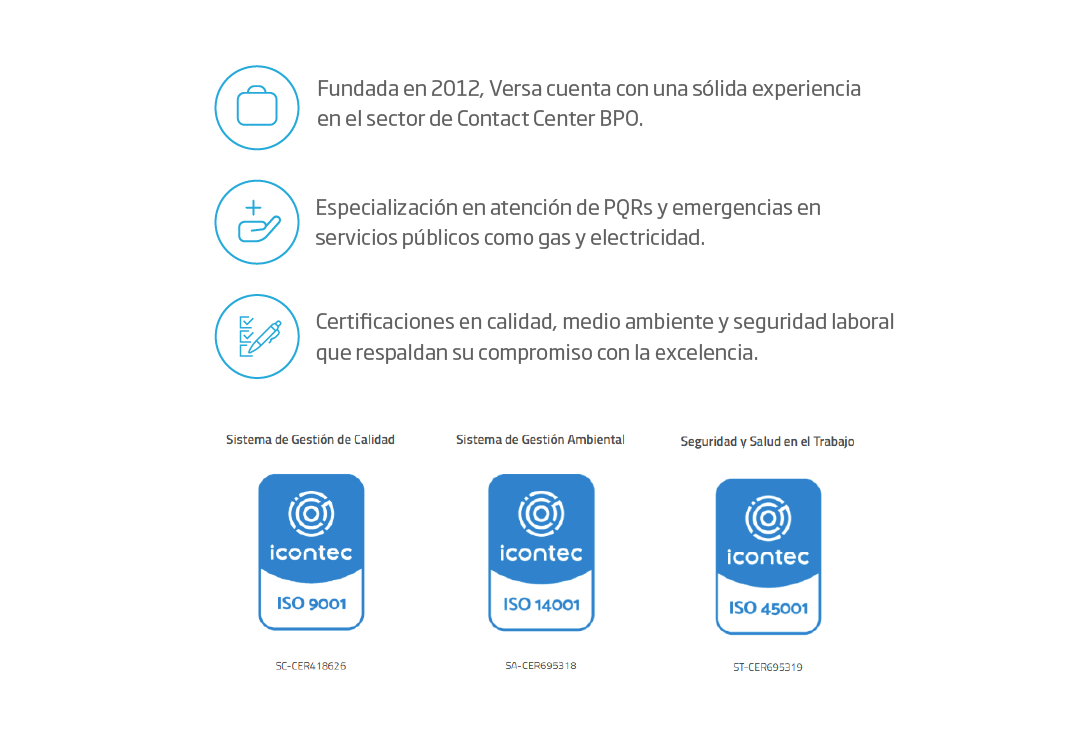 Gracias a su experiencia en el sector BPO y su enfoque en servicios públicos, Versa ha fortalecido los canales de comunicación de Promigas mediante soluciones multicanal, atención especializada en PQRs y gestión de emergencias. Esta sinergia ha permitido optimizar procesos, mejorar la experiencia del usuario final y garantizar una atención oportuna, eficiente y alineada con los más altos estándares de calidad.